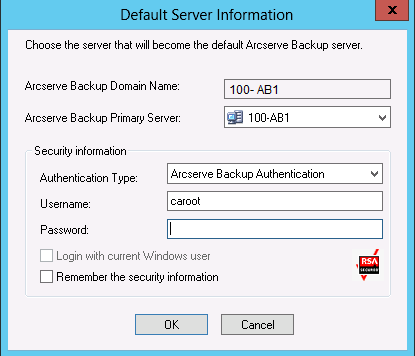 By default, Arcserve Backup does not remember your security information. To save the user name and password information that you entered for this server, you must explicitly select Remember the security information. If you do not save this information, Arcserve Backup prompts you to provide Arcserve Backup security credentials the first time you open managers, wizards, and so on, and you must provide an Arcserve Backup user name and password.