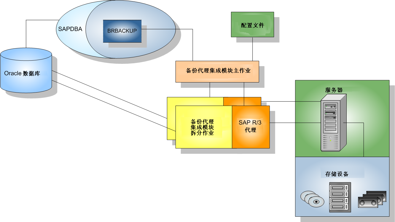 下面的图示说明选件如何通过执行并行作业处理信息并且不会中断其他的 SAP R/3 活动: