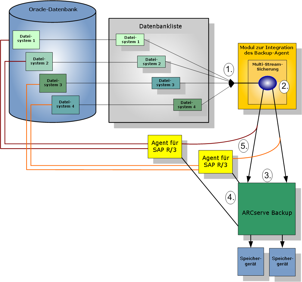 Nachfolgendes Diagramm veranschaulicht das Sichern der Daten von vier Dateisystemen auf zwei Speichergeräten: