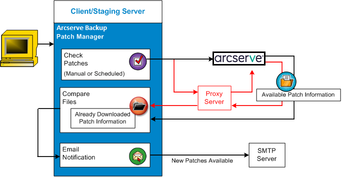 通过 Arcserve Backup Patch Manager,能够直接检查来自 Arcserve 新的可用 Arcserve Backup 修补程序和更新,也可以通过代理服务器进行检查(按照配置)。此可用修补程序检查功能可以从用户界面 (GUI) 手工触发,也可以根据修补程序排定程序的指定自动触发。