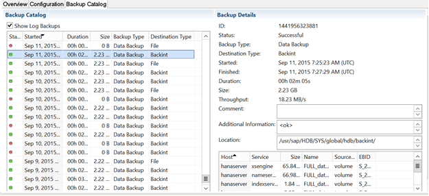 È possibile visualizzare tutti i registri relativi ai processi di backup nel catalogo di backup di SAP HANA Studio. Fare doppio clic su Backup nella visualizzazione Sistemi per visualizzare il catalogo di backup.