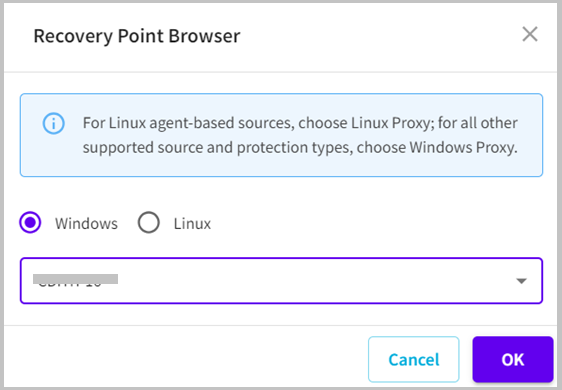 - If you want to view recovery points of Linux agent-based sources, select Linux as a proxy server, and then select a source from the drop-down list as needed.