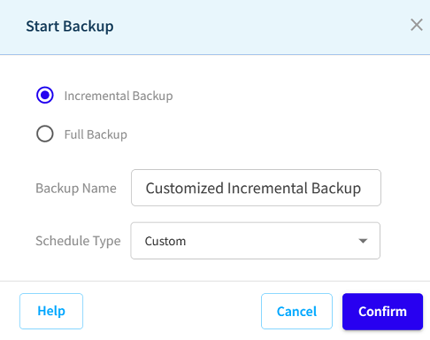 - If no backup name is specified, by default, it is automatically named as Customized Full or Incremental Backup.