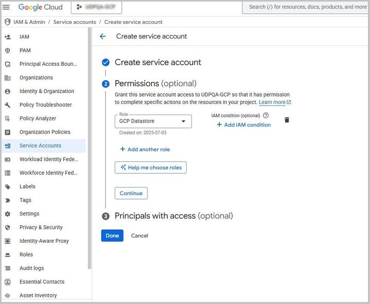 - If you do not want to set permissions now, click Done to finish creating the service account.