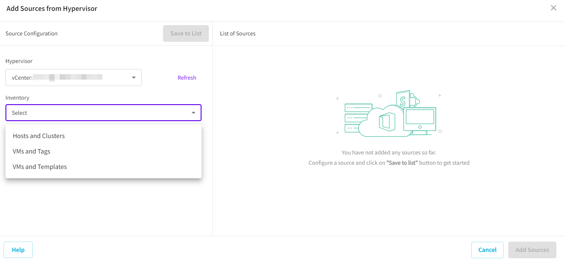 - On the Sources screen, click Add Source(s) > Add Source(s) from Hypervisor.