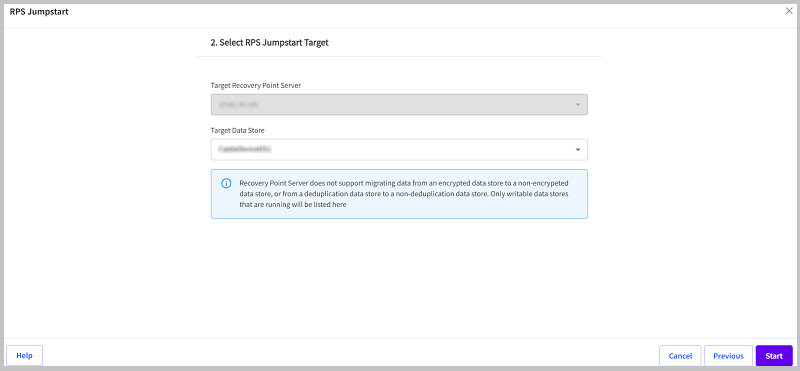 - On the RPS Jumpstart screen, under RPS Jumpstart - 2. Select RPS Jumpstart Target, from the Target Data Store drop-down list, select the target data store as needed.