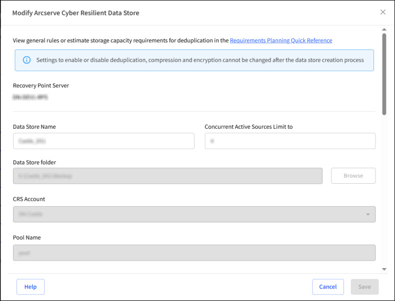 - The Modify Arcserve Cyber Resilient Data Store dialog opens.