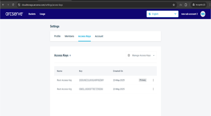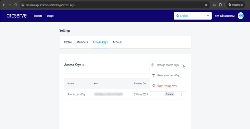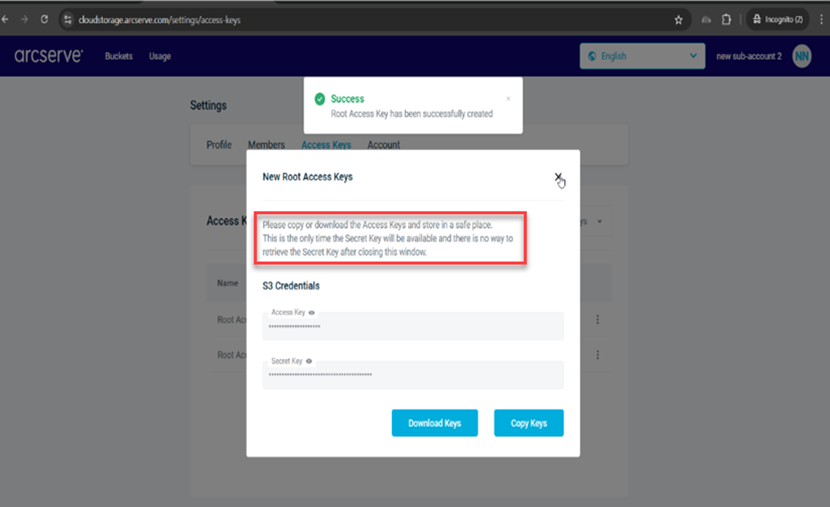 You can create or get a root access key in your Arcserve Cloud Cyber Resilient Storage (ACCRS) sub-account in the Arcserve Cloud Storage portal.