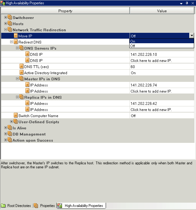 - Set the Move IP option to On. Ensure that the IP address under Move IP, IP/Mask matches the production server IP address: this is the IP address that will switch over. If you are moving more than one IP address you can add multiple production IP addresses by selecting Click here to add new IP/Mask.
