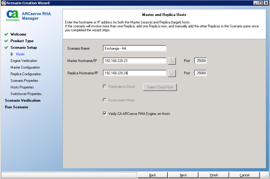 During the initial run of the Scenario Creation Wizard, enter the CA-IP and Replica IP addresses in the Master Hostname/IP and Replica Hostname/IP boxes, instead of the server names.