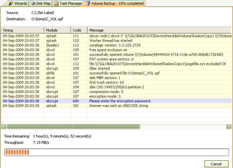 The Task Details tab shows status information about a currently running or completed task. (These tasks include a volume backup, volume restore, or verify image.) You can control the display of these tasks by clicking Show Details / Hide Details in the Task Manager tab. For example: