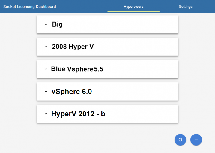 This screen shows a sample list of hypervisors defined in the Socket Licensing Services dashboard.