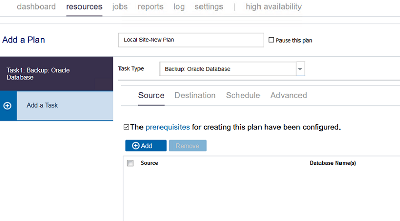 备份计划包括对节点执行备份并将数据存储到指定目标的备份任务。每个任务均包括定义源、目标、排定以及其他备份详细信息的参数。本节提供有关如何为 Oracle 数据库创建备份计划的信息。