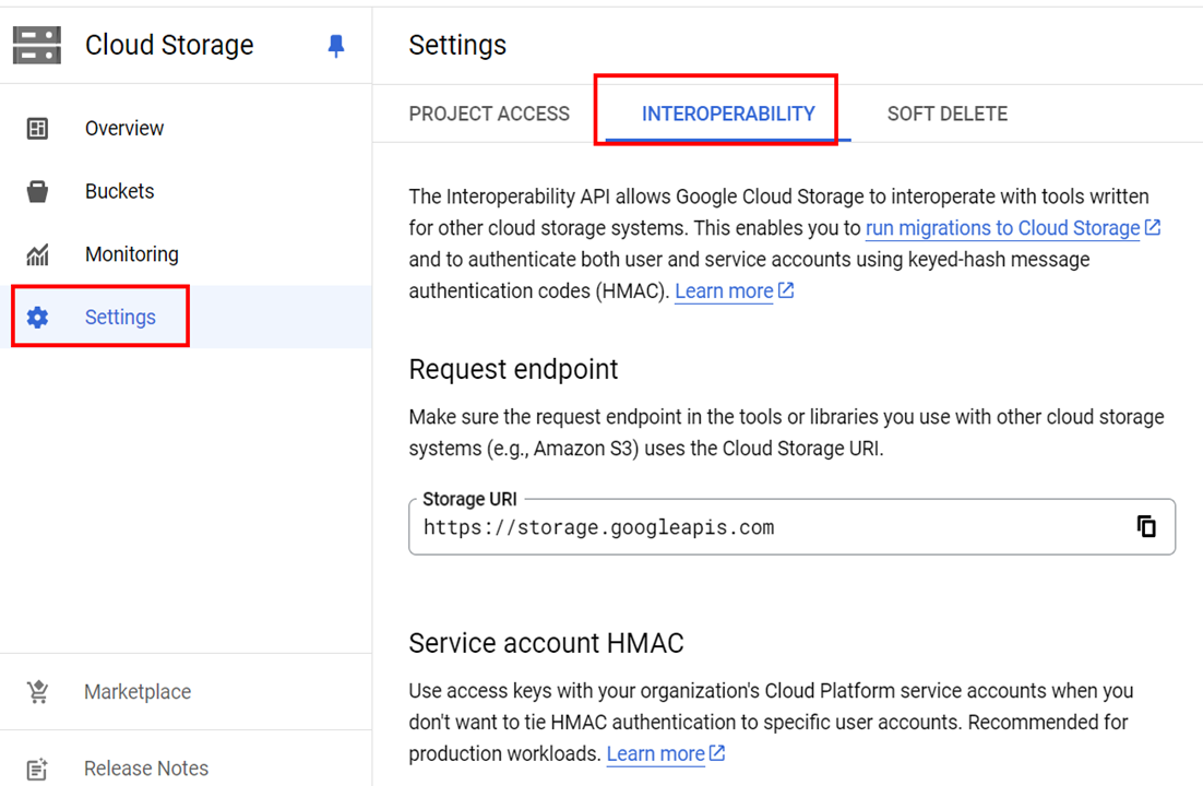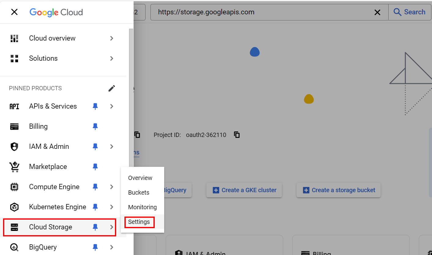 - 转到 Google Cloud 的“Navigation menu”(导航菜单)>“Cloud Storage”(云存储)>“Settings”(设置)。