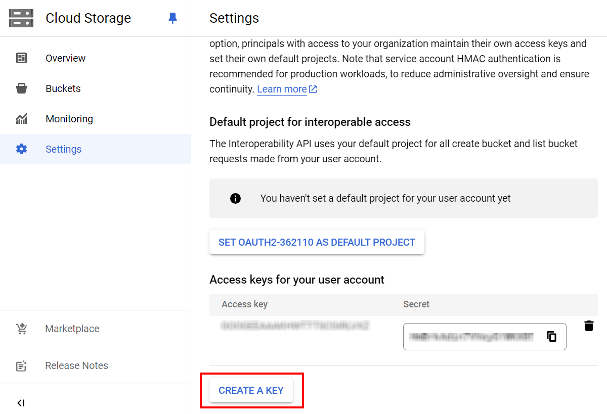 - 有关访问和秘密密钥的详细信息,请参阅 https://cloud.google.com/storage/docs/migrating#keys