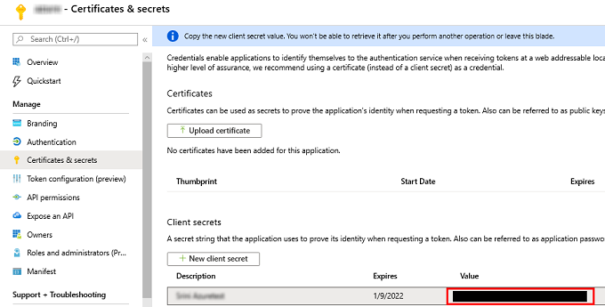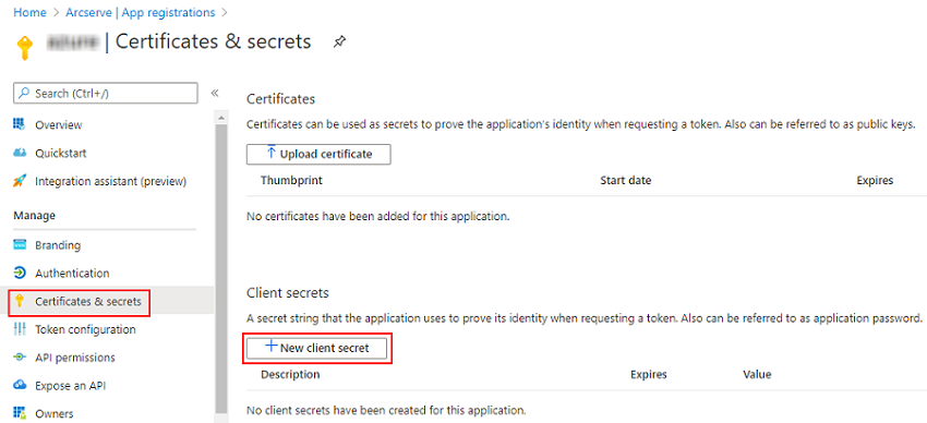 - 在“应用程序注册”页面上,选择应用程序,导航至“管理”下方左侧窗格的“证书和密钥”,然后单击“新建客户端密钥”以添加客户端密钥。