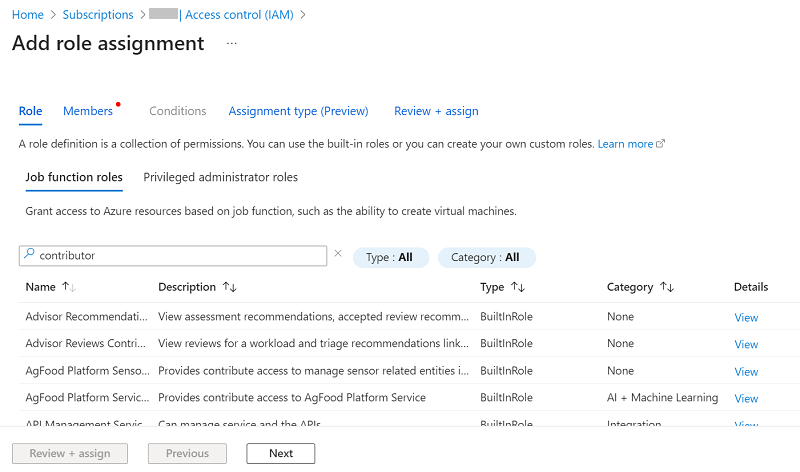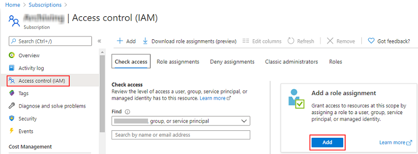 - 在您的订阅页面上,转到“访问控制 (IAM)”,单击“添加”,然后选择“添加角色分配”。