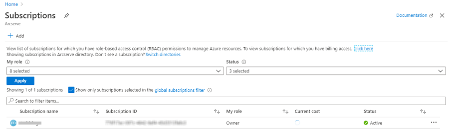 - 复制并保存订阅 ID。在 Arcserve UDP 中添加 Microsoft Azure 云帐户时,将使用该 ID。