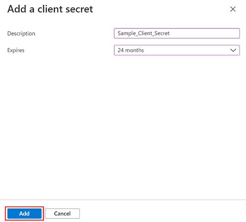- 在“Add a client secret”(添加客户端密钥)页面上,输入说明,根据需要从下拉列表中选择到期时间间隔,然后单击 Add(添加)。