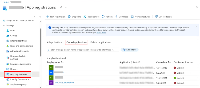 - 导航到 Microsoft Entra ID > 应用程序注册 > 拥有的应用程序,然后选择您的应用程序。