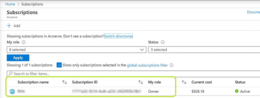 - 注意: 如果订阅列表未显示所需订阅,请选择“global subscriptions filter”(全局订阅筛选)。请确保为门户选择了所需的订阅。
