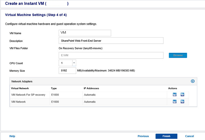 重要信息!当在作为 SharePoint 环境的 Web 前端服务器的计算机上创建即时 VM 时,请再添加一个网络适配器用于传输备份数据文件。新适配器的 IP 地址应与 SharePoint 的原始 Web 前端服务器在相同的虚拟网络中,并处于相同的 IP 段中。这样,原始 SharePoint 环境就可以使用该网络适配器访问具有即时 VM 的任何共享文件夹。