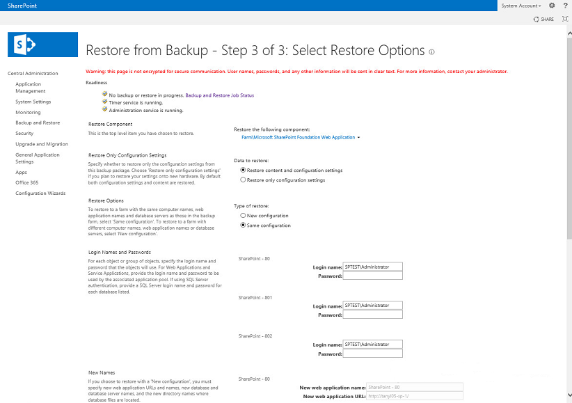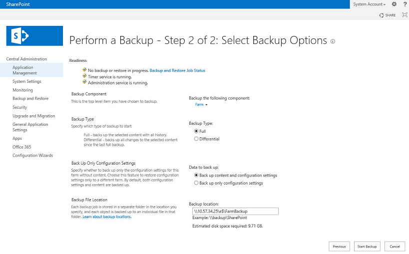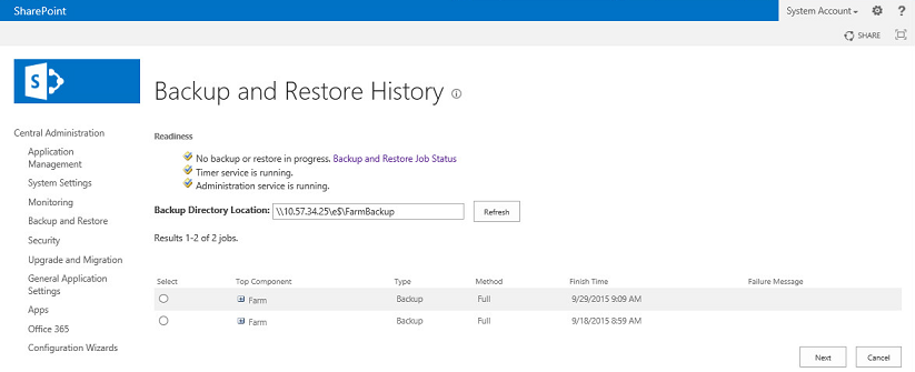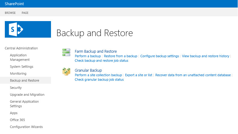 - 登录到计算机为 SharePoint 环境的 Web 前端服务器的即时 VM。打开“中央管理”,单击“备份和还原”标题,并选择“执行备份”链接。