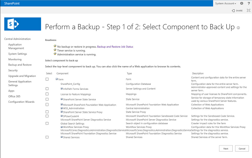 - 例如,选择所有服务器场组件或 SharePoint 服务组件或 Web 应用程序组件。