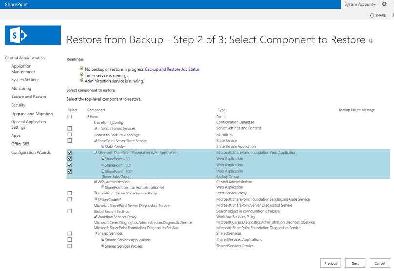- 选择您想要从服务器场还原的组件,然后单击“下一步”。
