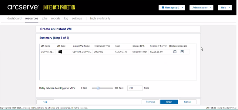 “摘要”屏幕显示选定节点的列表,其中包含“VM 名称”、“VM 类型”、“即时 VM 名称”、“管理程序类型”、“主机”、“源 RPS”、“恢复服务器”和“启动顺序”等详细信息。您可以验证详细信息,并按照要启动的顺序确定 VM 的优先级。