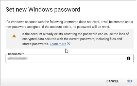 - 键入需要在实例中创建的用户名(通过该用户名可以进行 RDP),然后单击“设置”。