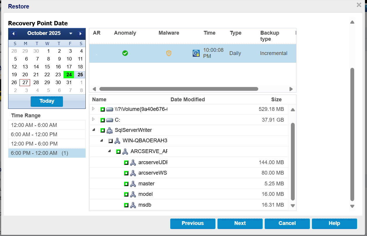 - 在“还原”屏幕上,从“恢复点日期”选择恢复的日期,从“时间范围”选择恢复的排定时间,从表中选择 RPS(SQL 数据库),然后单击 下一步。