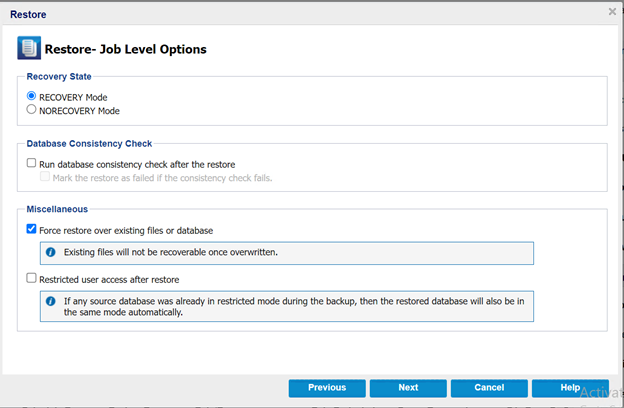 - 强制还原现有文件或数据库: 此选项将覆盖位于还原目标的现有数据库文件。不为现有数据库文件选择此选项会导致还原不完整。当数据库文件是新文件时,您可以忽略此选项。