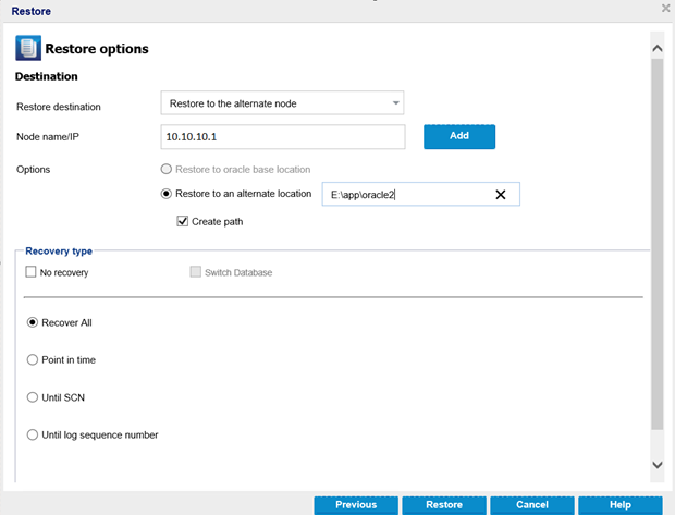 - 在禁用“Change Block Tracker”(更改块跟踪器)的情况下执行备用节点还原时,还原可能会失败。因此,在所需的日志可用且可以在还原后手动恢复数据库时,请选择“仅还原”选项。作为一种变通方法,可以先启用“Change Block Tracker”(更改块跟踪器),然后再对源节点执行备用节点还原。