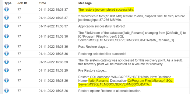 - 還原完成後,檢視 [活動日誌] 中的還原狀態並重新命名資料庫。