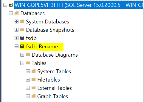 - 資料庫名稱的變更會反映在 SQL Management Studio 中。