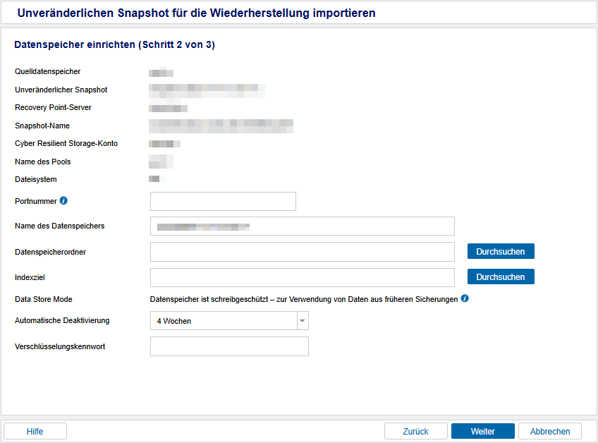 - Verschlüsselungskennwort: Wenn der Datenspeicher verschlüsselt ist, geben Sie das Verschlüsselungskennwort ein.
