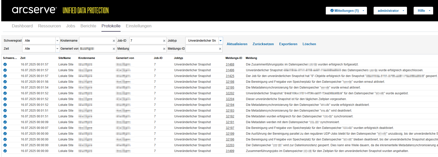 - Protokolle anzeigen: Um Protokolle für einen bestimmten Snapshot anzuzeigen, klicken Sie auf Protokolle anzeigen für den Snapshot, den Sie anzeigen möchten. Die Seite "Protokolle" zeigt eine Liste der vorhandenen Protokolle mit Details wie Schweregrad, Zeit, Standortname, Knotenname, Erstellt von, Job-ID, Jobtyp, Meldungs-ID und Meldung an. Mit den Suchfiltern können Sie nach Protokollmeldungen suchen. Sie können auch eine Protokollliste exportieren. Zum Exportieren klicken Sie rechts oben auf die Schaltfläche Export.