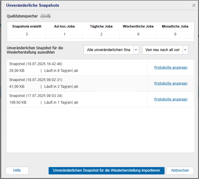 - Unveränderlichen Snapshot zur Wiederherstellung importieren: Wenn Sie einen Snapshot zur Wiederherstellung importieren möchten, wählen Sie den Snapshot aus, den Sie zur Wiederherstellung importieren möchten, und klicken dann auf Unveränderlichen Snapshot zur Wiederherstellung importieren.