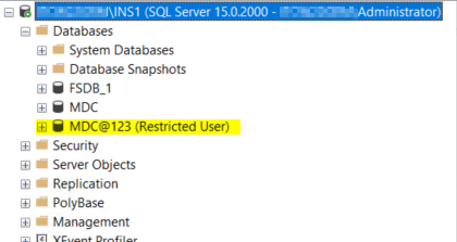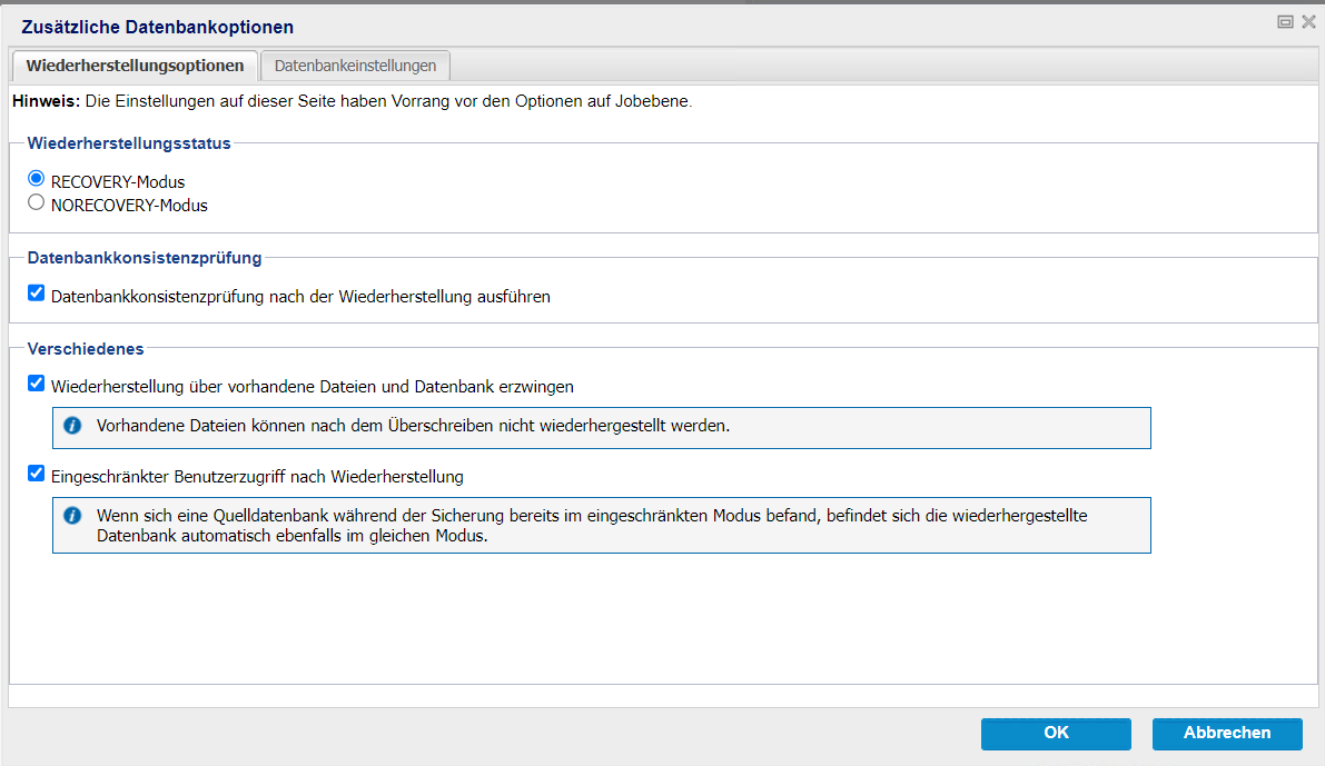 - Hinweis: Wenn sich die Quelldatenbank während der Sicherung bereits im eingeschränkten Modus befand, bleibt die wiederhergestellte Datenbank automatisch im gleichen Modus.