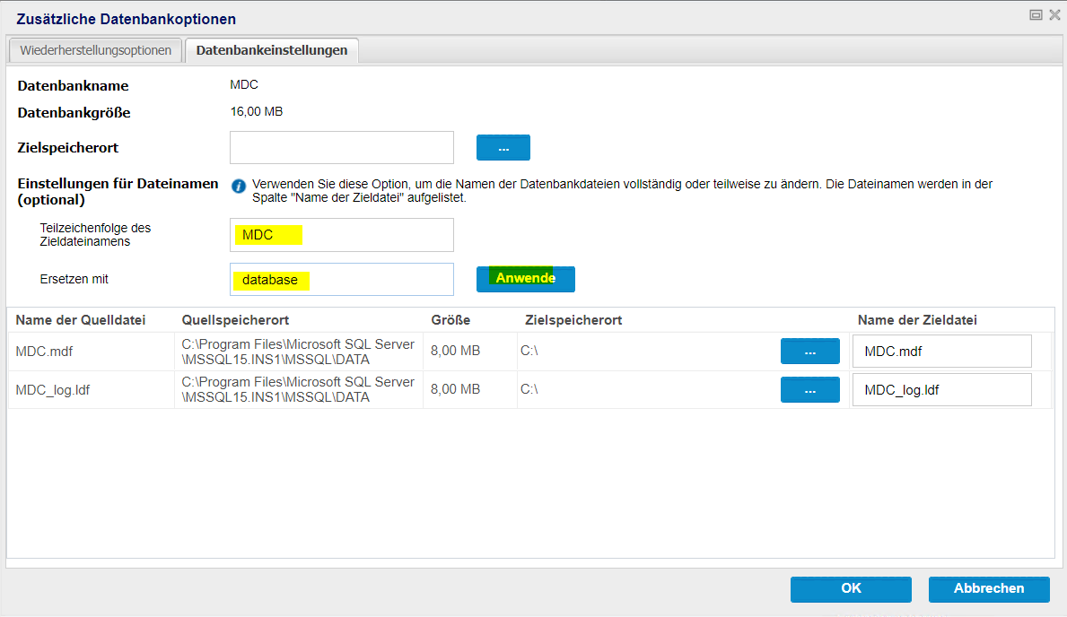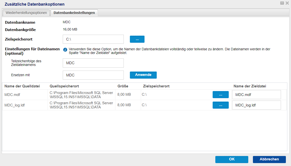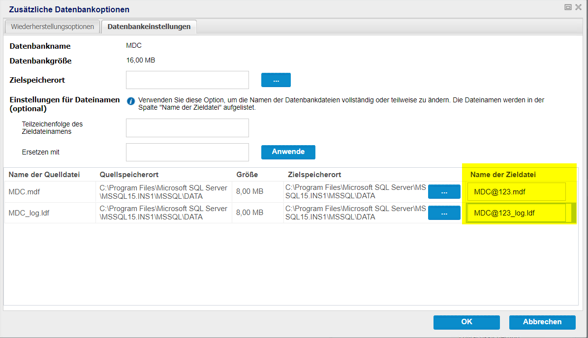 - Hinweis: Wenn Sie den Zielspeicherort ändern, wird auch das Ziel für alle Datenbankdateien aktualisiert.
