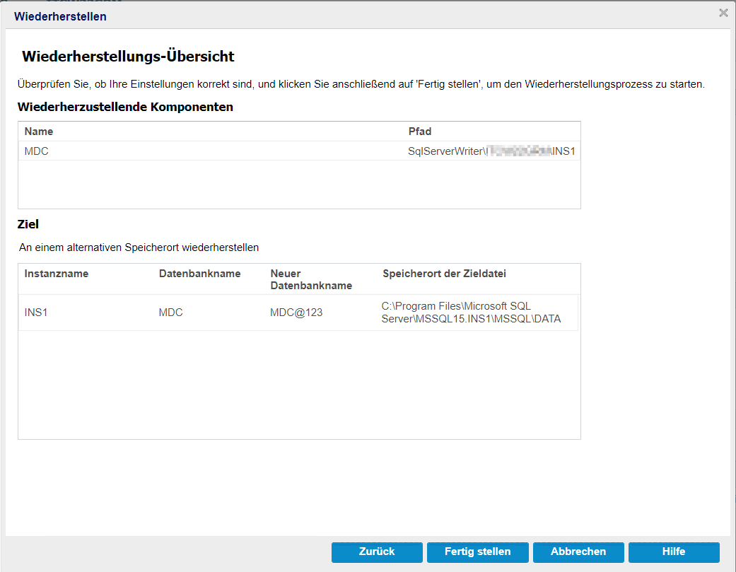 - Überprüfen Sie, ob die Einstellungen richtig sind, und klicken Sie dann auf Fertigstellen, um den Wiederherstellungsvorgang zu starten.