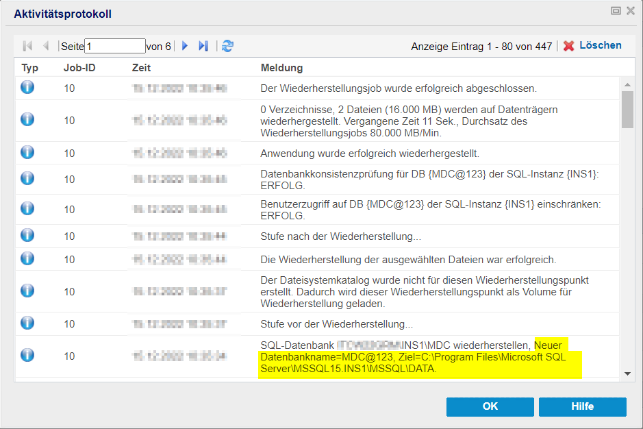 - Nachdem die Wiederherstellung abgeschlossen ist, können Sie den Status der Wiederherstellung im Aktivitätsprotokoll einsehen. Er enthält auch Informationen zum Umbenennen der Datenbank und zum neuen Zielspeicherort.