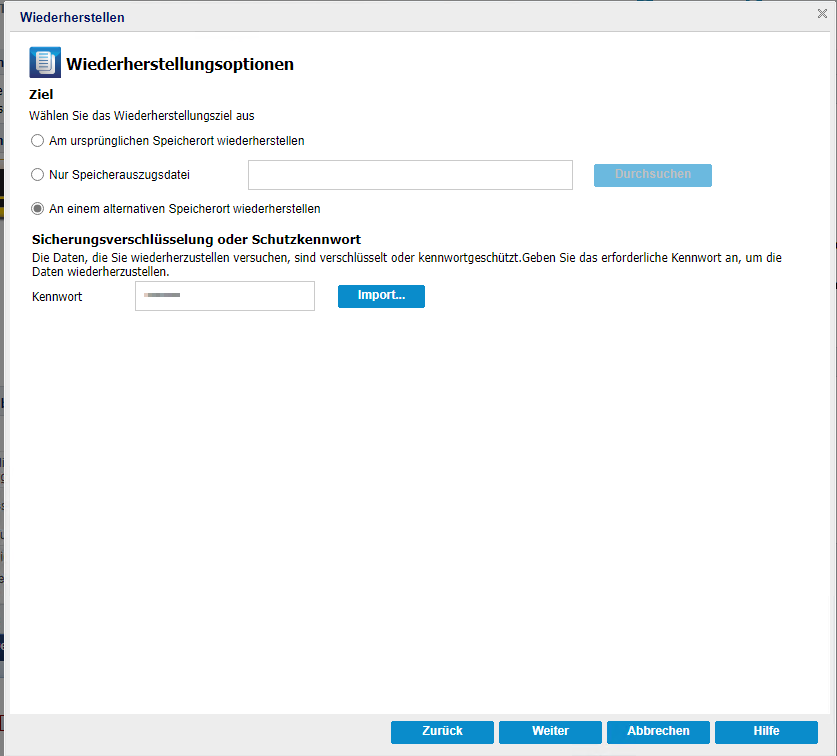 - Hinweis: Wenn die Daten, die Sie wiederherstellen möchten, verschlüsselt sind, geben Sie das Kennwort nach Bedarf an.
