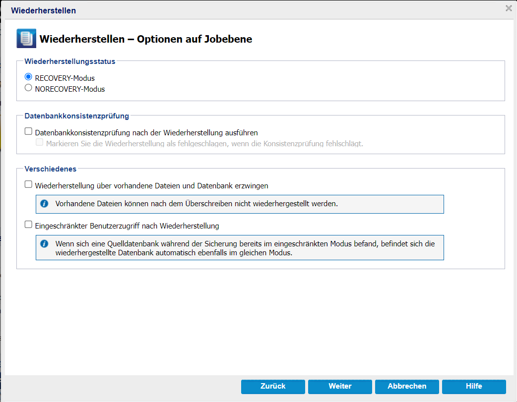 - NORECOVERY-Modus: Die Datenbank geht in den Status "RESTORING" über, um zu verhindern, dass Benutzer auf die Datenbank zugreifen. Um die letzte Sicherung wiederherzustellen und die Datenbank online zu stellen, verwenden Sie die Option "RECOVERY-Modus".