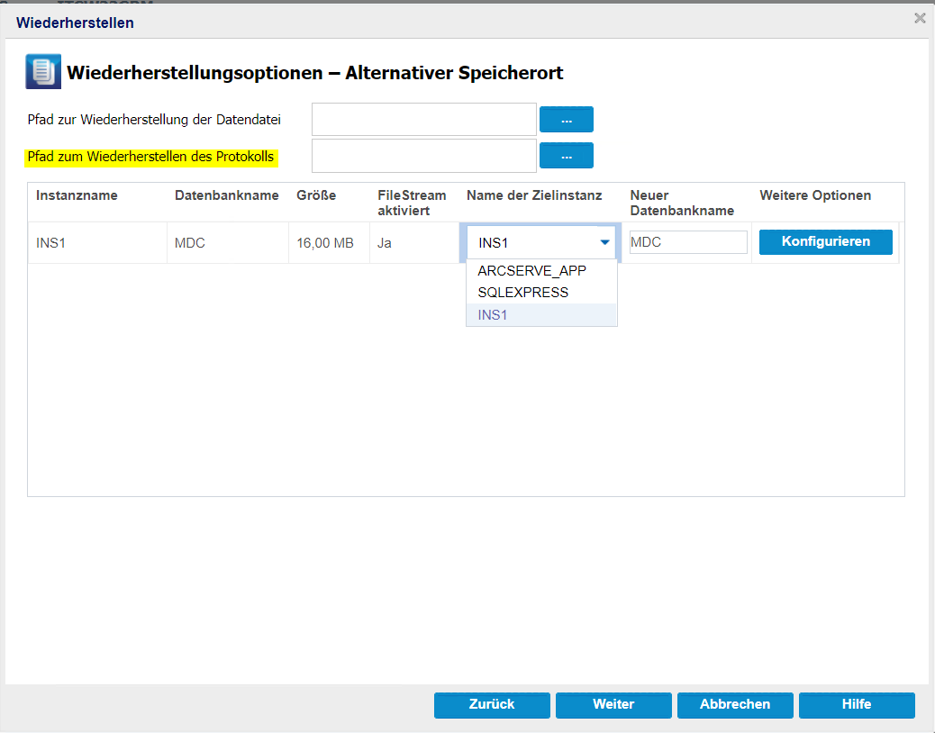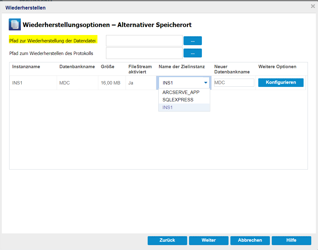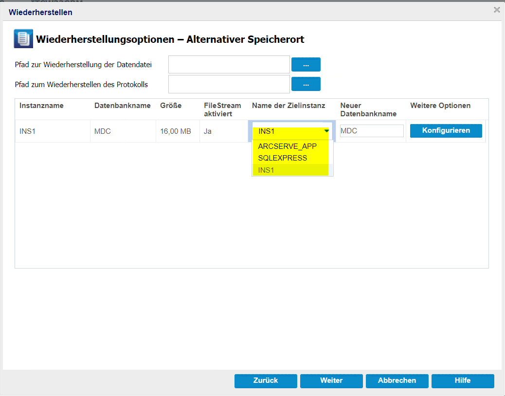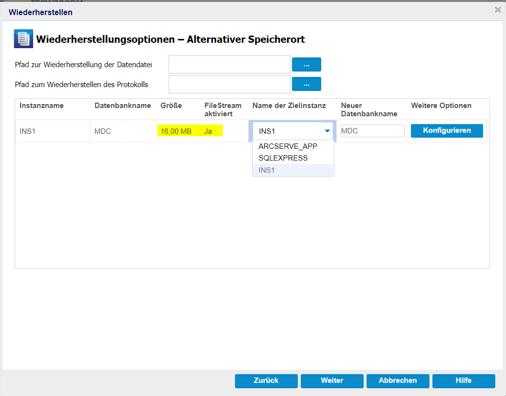 - Hinweis: Wenn für eine Datenbank FileStream Enabled aktiviert ist, werden im Feld "Name der Zielinstanz" nur FileStream Enabled-Server aufgelistet. Wenn FileStream jedoch nicht aktiviert ist, zeigt der Name der Zielinstanz sowohl FileStream-aktivierte als auch deaktivierte Datenbanken an.