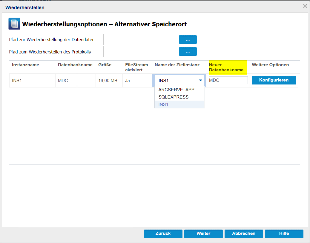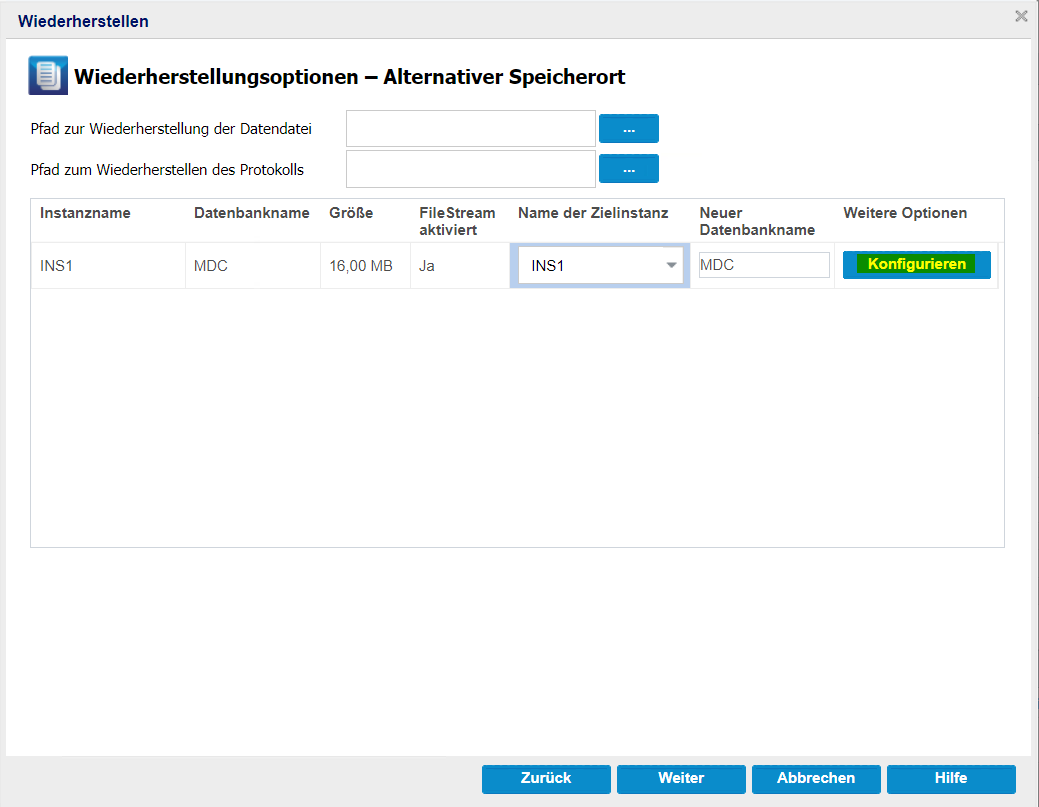 Wiederherstellen der SQL-Datenbank auf einer alternativen Instanz auf demselben Server