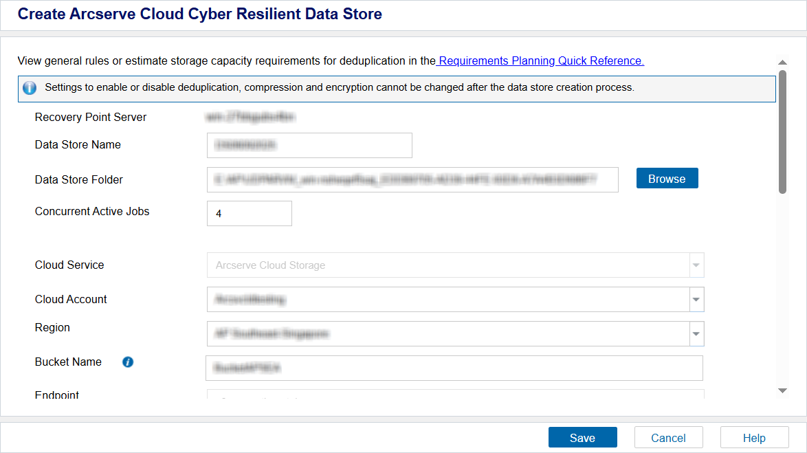 - The Create Arcserve Cloud Cyber Resilient Data Store dialog appears.