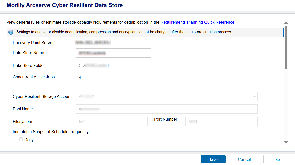 You can modify an existing Arcserve Cyber Resilient data store. However, the following settings cannot be changed: