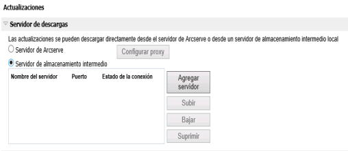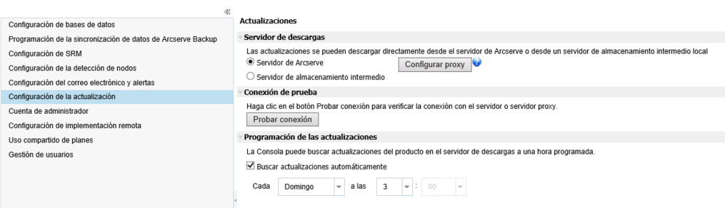 La página Actualización de la configuración le permite establecer el servidor de descargas y la programación de la actualización para configurar actualizaciones. Se pueden proporcionar detalles sobre los valores de configuración de proxy del servidor de Arcserve o del servidor de almacenamiento intermedio para la opción Servidor de descargas.